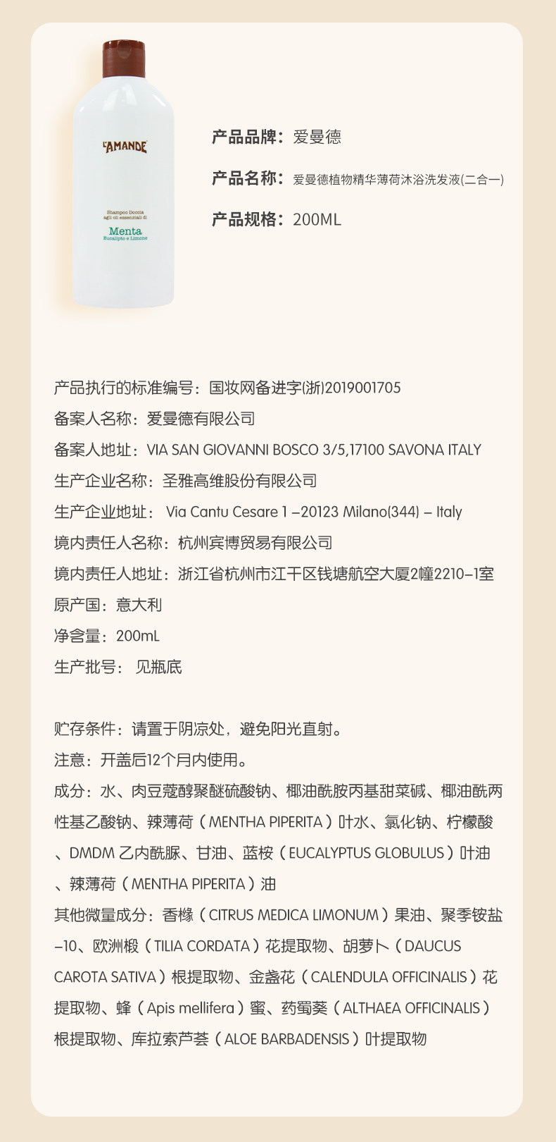 爱曼德精华薄荷沐浴洗发液(二合一)